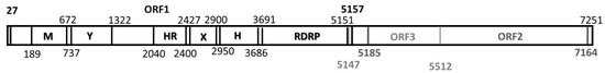 - Bile sample B1. We were able to assemble one complete hepatitis E virus genome, denoted MXCDg3a_B1c|_2016 with a coverage of 354.62. This genome is 7241 nucleotides (nt) long, excluding the poli-A tail (12 nt) at the 3’ termini. The genome consisted of 5’ UTR of 27 nt (1–27); three open reading frames—ORF1 of 5120 nt (27–5147), ORF2 of 1979 nt (5185–7164), ORF3 of 365 nt (5147–5512)—and a 3’ UTR of 77 nt (7164–7241), followed by the poli-A tail (Figure 1). This sequence had been deposited at GenBank under accession no. MG833836.