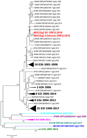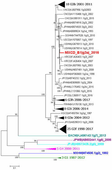 Phylogenetic analyses were performed using complete genome sequences and the capsid ones. The first analysis was constructed with sequences of genotype 3 reported in GenBank and also strains of other genotypes. The complete B1 sequence was included (MXCDg3_B1c|_2016) in the analysis and, as shows Figure 2, it clusters with genotype 3 subgenotype a (G3a).