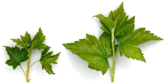 Symptoms observed on American blackcurrant infected with Ribes americanum virus A. Infected Ribes americanum cultivar Gall (PI 617879, left) showing ragged leaf margins and crinkled leaf surface compared to healthy plant (right).