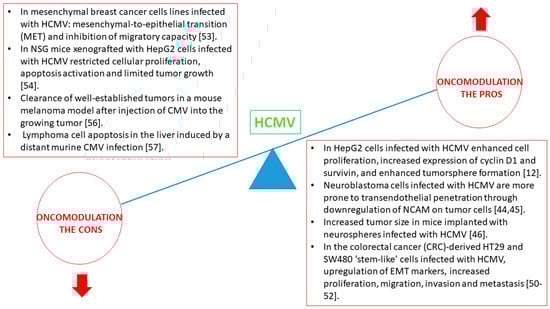 The pros and cons of oncomodulation following human cytomegalovirus (HCMV) infection. NSG—NOD/SCID Gamma; NCAM-Neural Cell Adhesion Molecule.