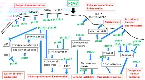 The human cytomegalovirus belongs to the Herpesviridae family with a double stranded DNA genome of 236 kbp in size [1]. In contrast to previous predictions [2,3], the translated products from open reading frames (ORF) in human cytomegalovirus (HCMV) genome are much more numerous than previously believed because of the presence of viral short ORFs, alternative splicing, and translation on cytosolic transcripts outside of conserved reading frames [4]. Several cellular functions involved in tumor development are targeted by HCMV gene products including cell cycle dysregulation, cellular immortalization, mutation and instability of the viral genome, enhanced cell survival, and immune escape with tumor spread [5,6,7,8]. In addition, HCMV infects several cell types present in tumoral tissue and microenvironment.