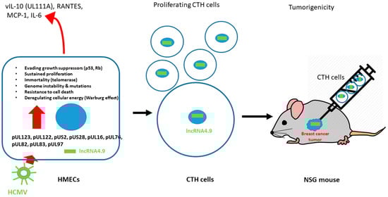 Although the appearance of colonies in soft agar seeded with HCMV-infected cells indicates cellular transformation, the tumor growth in xenografted mice following injection of HCMV-infected cells is required to directly assess the tumorigenic potential of HCMV. Recently, the injection of CMV-transformed HMECs (CTH cells), which were obtained after prolonged culture of HMECs infected with a clinical strain HCMV-DB in vitro, resulted in the development of tumors following their injection in NOD/SCID Gamma (NSG) mice [15]. The tumor growth following injection of CTH cells in NSG mice was fast [15]. In tumor biopies, a limited part of viral DNA was detected, namely the lncRNA.9 gene [15]. The HCMV lncRNA4.9 gene is also detected in biopsies of patients with breast cancer [15,125]. Thus, the HCMV-DB-infected HMEC model points toward a direct role for HMCV in oncogenesis, from viral proteins activating oncogenic pathways in infected cells to tumor growth in NSG mice xenografted with CTH cells (Figure 3).