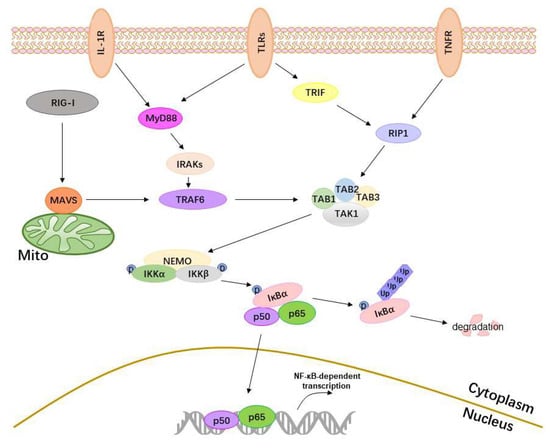 The nuclear factor-κB (NF-κB) family is composed of five related transcription factors: p50, p52, p65, c-Rel, and RelB. The activation of classical NF-κB signaling involves the NF-κB dimer p50/p65, but nonclassical NF-κB signaling involves p52/RelB. In the classical NF-κB signaling pathway, signaling molecules include NF-κB (IκB) kinases (IKKs), IκBα, p50/p65, and IKK upstream receptors and adaptor proteins. The major receptors are toll-like receptors (TLRs), retinoic acid-inducible gene I (RIG-I), tumor necrosis factor (TNF) receptor (TNFR), and interleukin 1 receptor type 1 (IL-1R1), and the major adaptor proteins are myeloid differentiation primary response gene 88 (MyD88), Toll/IL-1 receptor (TIR)-containing adaptor-inducing IFNβ (TRIF), and mitochondrial antiviral signaling protein (MAVS).
