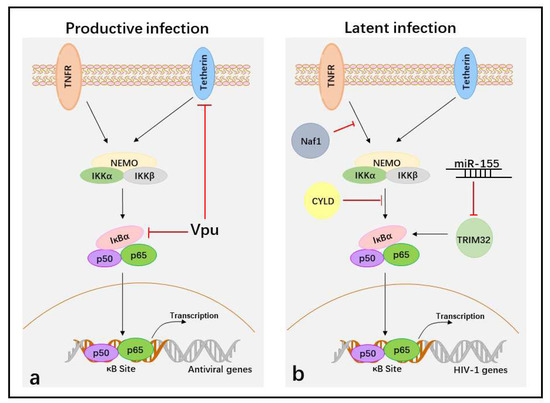 Suppression of the activation of NF-κB to facilitate HIV-1 immune evasion in the different life cycles. (a) In productive HIV-1 infection, Vpu protein targets tetherin and IκBα to block NF-κB-dependent antiviral gene transcription during later stages. (b) In latent infection, the cellular proteins Naf1 and CYLD inhibit NF-κB activity and block p50/p65 binding at κB sites in HIV-1 LTR to maintain HIV-1 latency, whereas miR-155 blocks p50/p65 binding at κB sites in HIV-1 LTR by targeting TRIM32. The black arrows indicate induction of NF-κB activation and red T bars indicate inhibition of NF-κB activation.