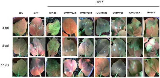 Visual observation of leaves from transgenic N. benthamiana 16C plants under UV light at three, five, and 10 days post-infiltration (dpi). Non-infiltrated (16C), infiltrated with Agrobacterium tumefaciens harboring pK-GFP alone (GFP), and co-infiltrated with pK-GFP plus: Tav-2b, OMMVp23, OMMVp82, OMMVp8, OMMVp6, OMMVCP, and OMMV.