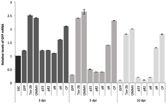 Mean relative levels of GFP mRNA ± standard error (SE) obtained from three infiltrated 16C N. benthamiana plants (biological replicates) at three dpi, five dpi, and 10 dpi, determined by RT-qPCR and normalized by the levels of phosphatase 2A (PP2) and F-box protein (F-box) reference genes. 16C: 16C non-inoculated plants; GFP: single infiltration with pk_GFP; Tav-2b, OMMVp23, OMMVp82, OMMVp8, OMMVp6, OMMVCP, and OMMV: co-infiltration of pk_GFP with the corresponding constructs. The GFP transgene level in non-infiltrated N. benthamiana 16C plants was used as a standard and given a value of 1.