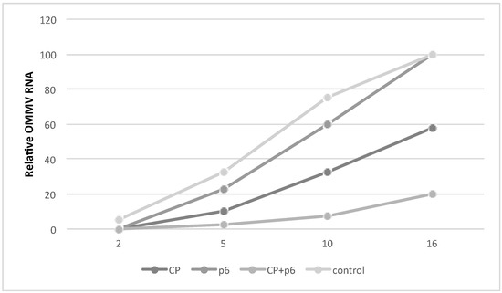 The appearance of disease symptoms was monitored at two dpi, five dpi, 10 dpi, and 16 dpi and recorded as a disease index scale. As shown in Figure 3, at two dpi, plants expressing OMMV CP, OMMV p6, and both OMMV CP and p6 did not show any symptoms, whereas two plants in negative control showed mild symptoms (DSI, 5%). At five dpi, plants from all groups showed symptoms, but only a few plants in the negative control group reached the disease index scale of 2, presenting the highest DSI (32.5%), followed by plants expressing p6 alone (22.5%). At 10 dpi and 16 dpi, control plants showed severe symptoms (DSI 75% and 100%, respectively). Plants expressing OMMV p6 showed a slight lower DSI at 10 dpi (60%), but also reached 100% at 16 dpi, showing only a delay in the appearance of symptoms. At the same time points, plants expressing OMMV CP presented considerably lower DSIs (32.5% and 57.5%), indicating a tolerance to OMMV infection. In contrast, plants expressing both OMMV CP and p6 showed a maximum DSI of 20% at 16 dpi, indicating a very high tolerance to OMMV infection. Additionally, in the experiments, an average of 60% of the plants expressing OMMV CP and p6 did not present any viral symptoms at 16 dpi, suggesting a resistance to OMMV. Plants expressing OMMV CP also showed some resistance, although in a lower level (20%). Plants were monitored until 30 dpi, and the highest DSI was 60% in plants expressing OMMV CP, and 30% in plants expressing both OMMV CP and p6, no plants reaching the maximum disease index.