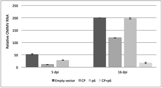 Viral accumulation levels were determined by real time RT-qPCR (Figure 4), and the results are consistent with the disease severity symptoms observed. At five dpi, the mean viral accumulation ± SE in the upper non-inoculated leaves of plants expressing OMMVCP + p6 was 0.0, 11.0 ± 2 in OMMVCP, 28.5 ± 0.5 in OMMVp6, and 52.5 ± 2.5 in plants expressing the empty vector. Individual pairwise comparisons revealed significant differences (p < 0.01) between all of the treatments. At 16 dpi, the mean viral accumulation ± SE in the upper non-inoculated leaves of plants expressing OMMVCP + p6 was 17.5 ± 2.5, 119.0 ± 1.0 in OMMVCP, 197.5 ± 2.5 in OMMVp6, and 200.0 ± 0.0 in plants expressing the empty vector. Individual pairwise comparisons revealed significant differences between empty vector versus OMMVCP (p < 0.008); empty vector versus OMMVCP + p6 (p < 0.0032); OMMVCP versus OMMVp6 (p < 0.0011); OMMVCP versus OMMVCP + p6 (p < 0.005), and OMMVCP + p6 versus OMMVp6 (p < 0.0029). No significant differences were found between empty vector and OMMVp6 (p > 0.4205).