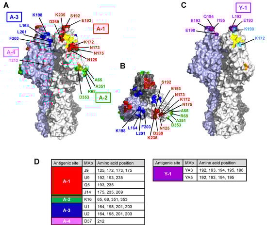 Antigenic sites in the hemagglutinin-esterase (HE) molecule of C/Ann Arbor/1/50 with both (A) a side view and (B) a top view, and (C) C/Yamagata/15/2004. A trimer complex, in which monomers are colored in white, gray, and light blue, is shown in a surface representation with the antigenic sites highlighted: the A-1 site is in red, the A-2 site is in green, the A-3 site is in blue, the A-4 site is in pink, and the Y-1 site is in purple. Residues 172 and 190 discussed in the text are colored light blue in (C). The residues involved in receptor binding and receptor destroying are colored yellow and orange, respectively. Images were created using PyMOL software, and the HE structure was obtained from the Protein Data Bank (PDB ID 1FLC). Amino acid positions are designated by numbering, excluded the 14-amino-acid-long signal peptide. The amino acid at position 212 (pink) in the A-4 site was referred from our previous report []. (D) Amino acid positions of monoclonal antibody (Mab) binding are shown.