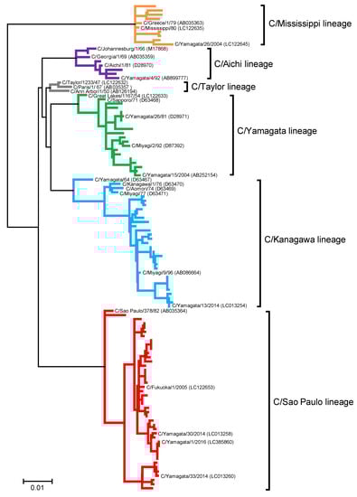 To investigate the possibility of antigenic drift among the six genetic lineages, genetic analyses were performed for influenza C viruses, including 107 strains previously reported between 1947 and 2014 [,] and eight strains newly isolated in 2016 (Table S1). These 115 strains were classified into six genetic lineages (Figure 2): 3 in the C/Taylor lineage, 10 in the C/Mississippi lineage, 8 in the C/Aichi lineage, 20 in the C/Yamagata lineage, 31 in the C/Kanagawa lineage, and 43 in the C/Sao Paulo lineage.