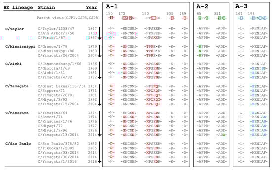 Amino acid sequence alignment of antigenic sites of the influenza C viruses. Boxed residues of the parent virus indicate the antigenic sites A-1 (red), A-2 (green), and A-3 (blue). Amino acid differences from the parent virus are shown in bold letters. The dots indicate deletions. Virus strains correspond to those analyzed in Table 5.
