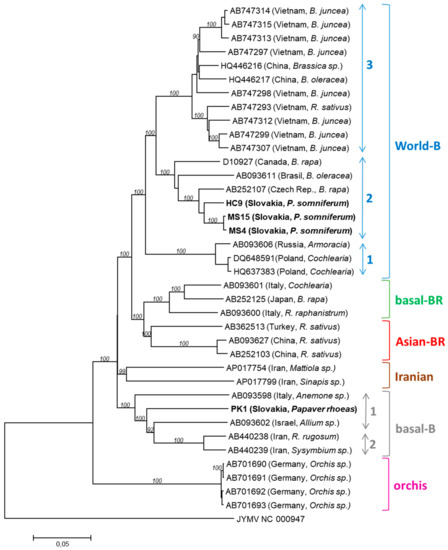 The currently known TuMV diversity includes six TuMV genogroups revealed by phylogenetic analysis of numerous TuMV isolates collected around the world: basal-B (Brassica), basal-BR (Brassica/Raphanus), Asian-BR, world-B, Iranian, and Orchis [14,15]. Despite the huge number of sequences accumulated during the recent years, the only genome sequence from oilseed poppy, originating from Poland, was reported as belonging to the world-B group [14].