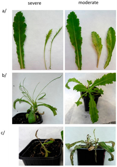 Both TuMV isolates could be mechanically transmitted to oilseed poppy plants with 40–66% efficacy (Table 1) as proved by DAS-ELISA. None of the symptomless plants tested TuMV-positive, showing a clear correlation between symptoms expression and virus presence as detected by DAS-ELISA. Different inoculum sources were used for these biological assays, likely resulting in different virus titers (original infected oilseed poppy leaves for HC9 or leaves of experimentally infected N. benthamiana for PK1, respectively), therefore no effort was made to compare the intensity of the symptoms induced by the two isolates. Notwithstanding, in all cases, two types of symptoms were observed (Table 1, Figure 2). One type of symptom consisted of chlorotic patterns and dark green spots on the leaf lamina (termed as “moderate”). The second type of symptom (“severe”) consisted of shoestringing, an extreme leaf deformation with loss of the limb part of the leaves (Figure 2). Irrespective of the symptomatology type, subsequent systemic necrosis was observed, leading to the stunting, wilting, and finally dying of positive plants 35–45 days post-inoculation. The experimental inoculation of N. benthamiana plants lead to 100% infection, with both TuMV isolates inducing leaf deformation, mosaics, and plant stunting. On the contrary, only one out of 40 R. sativus inoculated plants ended up infected, suggesting that this species may not be adapted to the study of Slovak TuMV isolates from poppy.