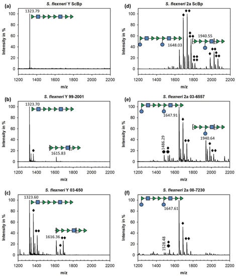 MALDI-TOF MS analysis of oligosaccharides enzymatically released from S. flexneri O-antigen (overnight at room temperature) by Sf6TSPwt and isolated by size exclusion chromatography (see Figures S1–S6 and Tables S1–S6). (a,d) S. flexneri Y and 2a probes from ScBp. (b,c,e,f) S. flexneri isolates from the Wernigerode collection. Oligosaccharide structures are given with monosaccharides in SNFG representation [41] (Rhap: green triangle, GlcpNAc: blue square, Glcp: blue circle). Modifications by O-acetylation (black diamonds), and monoglucosylated products (black crosses) are indicated.