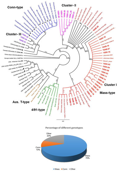 - Smati, R.; Silim, A.; Guertin, C.; Henrichon, M.; Marandi, M.; Arella, M.; Merzouki, A. Molecular characterization of three new avian infectious bronchitis virus (ibv) strains isolated in Quebec. Virus Genes 2002, 25, 85–93. [Google Scholar] [CrossRef] [PubMed]
