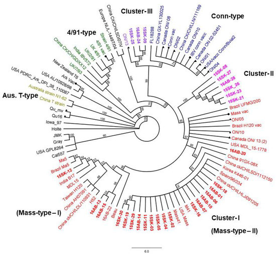 - Jang, J.H.; Sung, H.W.; Song, C.S.; Kwon, H.M. Sequence analysis of the s1 glycoprotein gene of infectious bronchitis viruses: Identification of a novel phylogenetic group in Korea. J. Vet. Sci. 2007, 8, 401–407. [Google Scholar] [CrossRef] [PubMed]