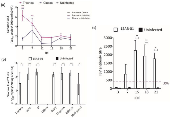 3.4.3. IBV Genome Loads Following Infection with 15AB-01 Mass Type IBV Isolate