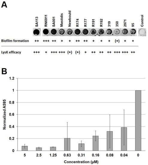 3.1. The Bacteriophage Endolysin LysK Is Active against Biofilms of Multiple S. aureus Strains