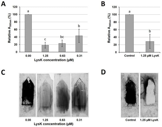 Efficacy of LysK against dynamic S. aureus SA113 biofilms grown on glass surfaces in the Biostream flow cell. Biofilms were grown for 20 h at 19 °C under continuous flow of medium. Glass slides were then submerged in solutions of LysK at different concentrations or buffer as a control for 5 h (A,C) or 2 h (B,D), and stained with crystal violet. The stain was dissolved in 96% ethanol and the A595nm measured spectrophotometrically (A,B). All values were normalized to the control. Error bars indicate standard deviations from at least three independent experiments. Bars with different letters are significantly different from each other (p < 0.05). Representative glass slides after washing and before solubilization of the stain are shown for the 5 h (C) and the 2 h (D) treatments.