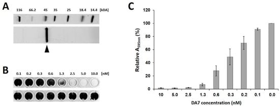 Purification and anti-biofilm activity of the polysaccharide depolymerase DA7. (A) Sodium dodecyl sulfate polyacrylamide gel electrophoresis (SDS-PAGE) of purified DA7 protein. The band of interest (expected molecular weight: 42.1 kDa) is marked by an arrow. (B) Static S. aureus SA113 biofilms were grown at 30 °C for 24 h, treated with increasing concentrations of DA7 (top) or buffer as a control (bottom) for 30 min at 30 °C, and stained with crystal violet (CV). (C) Relative A595nm values measured after dissolving the CV stain on residual biofilms in 96% ethanol after DA7 treatment as shown in panel B. Values are normalized to the control, and error bars represent standard errors of the mean from three independent experiments.