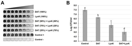 Synergistic effect of DA7 and LysK against S. aureus biofilms in static and dynamic models. (A) SA113 biofilms grown statically in 96-well plates were treated with two-fold serial dilutions of DA7, LysK, and mixtures of both enzymes at the ratios 50:50, 75:25, and 25:75, with the highest concentrations on the right and the lowest concentrations on the left of each row. After treatment, residual biofilms were stained with crystal violet. For each individual enzyme, the highest concentration used was the respective minimum biofilm eradication concentration (MBEC) and was defined as 100%. Highest concentrations of enzymes within mixtures are expressed as percentages of the respective MBECs. (B) Residual viable S. aureus on the glass surface of the Biostream flow cell after a 2 h treatment of dynamic biofilms with buffer (control), DA7 (0.625 nM), LysK (1.25 µM), or a combination of both (0.156 nM DA7 + 0.938 µM LysK, corresponding to a ratio of 25:75). Error bars represent standard deviations from at least seven independent experiments. Bars with different letters are significantly different from each other (p < 0.05).