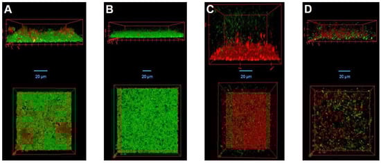 Confocal laser scanning micrographs of S. aureus biofilms treated with DA7, LysK, or a combination of both agents. SA113 biofilms were grown in IBIDI µ-slides for 20 h at 19 °C and then treated for 2 h with: buffer (A); 0.625 nM DA7 (B); 1.25 µM LysK (C); or a combination of 0.156 nM DA7 and 0.938 µM LysK (D). Residual biofilms after treatment were stained with LIVE/DEAD stain and then visualized by CLSM. Side views (top); and top views (bottom) of biofilm 3D reconstructions are shown. Live cells are depicted in green and dead cells as well as extracellular DNA in red.