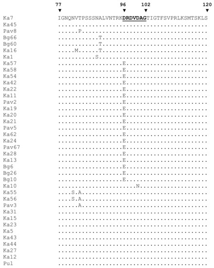 Western blot analysis of selected samples, differing in the sequence of the universal epitope, demonstrated that the antibody 5B was capable of detecting a set of bands in the case of isolates Ka5, Ka7, and Pav3 containing the epitope DRDVDAG (Figure 2). This result shows that the denatured CP can be recognized with the antibody 5B as effectively as its counterpart in the intact virus particle thus indicating that conformation of the CP molecule is not crucial for the antibody 5B binding. Apparently, the uppermost band represents the full-length CP. Its molecular weight (MW) calculated in accordance with the electrophoretic mobility was about 41 kDa, which is well above the MW based on the amino acid composition (36.8 kDa). The atypical mobility may be due to glycosylation of the serine and threonine residues in the N-terminal domain with N-acetyl glucosamine as was previously shown for the strains D, M, and Rec by glycoprotein staining of Western blots [46] and mass spectrometry [47,48]. The lower bands are considered the products of cleavage of the surface-exposed N-terminal domain of the CP by cell proteases [49]. The antibody 5B can successfully bind to a partially digested CP as the universal epitope is located near the protease-resistant core and not affected by the proteolysis. In agreement with the TAS-ELISA results, the isolate Ka10 was weakly stained and Bg26 and Pav67 were not detected with the antibody 5B. As with TAS-ELISA, the D96E-positive isolates Ka42 and Ka62 were barely detected by Western blot analysis. The alignment of aa sequences around the universal epitope did not show any relevant substitutions in its immediate context capable of affecting the antibody 5B binding (Figure 3).