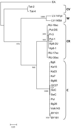 Apart from sequences of the new isolates listed in Table 1, those belonging to the strains C, CR, CV, W, and EA were retrieved from GenBank and employed in the analyses. These were SwC (Y09851), SoC (AY184478), GC27 (KY221840), Volk143 (KJ787006), BY181 (HQ840518), BY101 (HQ840517), RU-17sc (KC020124), RU-18sc (KC020125), RU-30sc (KC020126), Fl-3 (MG736812), Kp8-1 (MG736813), Kp8-2U (MG736814), Pul-1 (MG736815), Pul-DS (MG736816), Tat-2 (MF447179), Tat-4 (MF447180), LV-141pl (HQ670746), LV-145bt (HQ670748), and EA-2005 (AM157175) as phylogenetic outgroup. Multiple alignments were carried out as described previously [5] using the ClustalW v.2.1 or an older version of this program included in the BioEdit v. 7.2.4 software [42]. Nucleotide (nt) and deduced amino acid (aa) sequence identities were determined employing the ClustalW algorithm implemented in the MegAlign v. 7.1.0. (DNASTAR Lasergene package, DNASTAR Inc., Madison, WI, USA). The PhyML 3.0 version of maximum likelihood algorithm [43] was used for phylogenetic analysis. Graphical tree presentation was performed by MEGA7 program [44] choosing “root on midpoint” option. The recombination detection program v.4.69 (RDP4) [45] was employed to search for recombination in the aligned complete genome sequences using default settings, with the exception that “sequences are linear” and “list events detected by >4 methods” options were chosen.