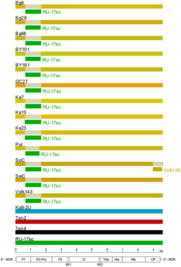 Unfortunately, most detected PPV-C isolates have not been characterized to date. Only four complete genome sequences of natural isolates from Belarus (BY101, BY181), Russia (Volk143), and Germany (GC27) have been deposited in GenBank. The full-length genomes of two more isolates SoC and SwC were sequenced after their maintenance in Nicotiana benthamiana [23] and may contain mutations resulting from adaptation to the herbaceous host. The insufficient number of available PPV-C sequences limits the capability to analyze their diversity, evolution, and genetic factors contributing to the adaptation to cherry [22].