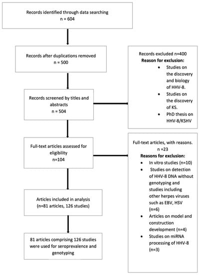 We identified a total of 604 articles from database searches, which were reduced to 500 after the removal of duplicates. Observational studies included for analysis were cross-sectional, prospective, retrospective and case report, which occurred at different settings such as rural, urban or hospital based. Out of the 500 articles, 81 articles met the inclusion criteria and were further analyzed (Figure 1). Some studies reported on multi-country and multi-site studies. One hundred and twenty-six studies on HHV-8 sero-epidemiology or genotypes, published from 1998–2017, were obtained from the 81 articles and met the inclusion criteria for analysis. About 64% (81/126) of the studies were available on HHV-8 seroprevalence; 29.3% (37/126) were available on HHV-8 genotypes; and 9.5% (12/126) of the studies were available for both seroprevalence and genotypes. Overall, 52.8% (28/53) of African countries had data on either seroprevalence or genotypes of HHV-8. Tables S1–S5 (Supplementary Materials) present studies from the different African regions included in the analysis.