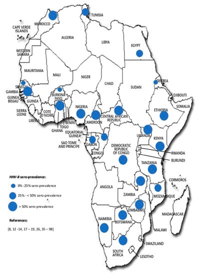 - Serraino, D.; Toma, L.; Andreoni, M.; Buttò, S.; Tchangmena, O.; Sarmati, L.; Monini, P.; Franceschi, S.; Ensoli, B.; Rezza, G. A Seroprevalence Study of Human Herpesvirus Type 8 (HHV8) in Eastern and Central Africa and in the Mediterranean Area. Eur. J. Epidemiol. 2001, 17, 871–876. [Google Scholar] [CrossRef] [PubMed]