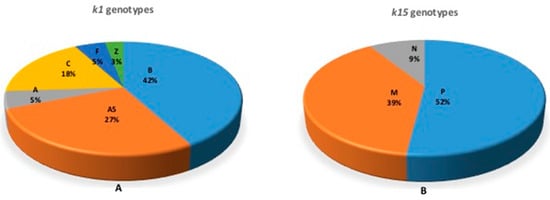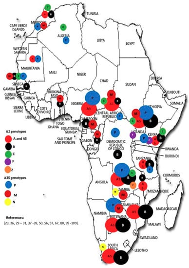 Based on the K1 gene, 33.9% (18/53) of African countries had data on genotypes, while 28.3% (15/53) of countries had data on K15 genotypes (Figure 3). Genotypes A, A5, B, C, F and Z were identified at frequencies of 5.3% (2/38), 26.3% (10/38), 42.1% (16/38), 18.4% (7/38), 5.3% (2/38) and 2.6% (1/38), respectively; genotypes P, M and N of the K15 gene were identified at frequencies of 52.2% (12/23), 39.1% (9/23) and 8.7% (2/23), respectively (Figure 4). Of the 18 countries from which K1 genotypes were reported, at least two genotypes were reported in each. Genotype Z was reported from only one study in Zambia involving children []. All other genotypes were reported in both children and adults. From the available data, there appears to be no trend in the distribution of genotypes across the continent. Worthy of note though is the description of K15 genotype N in Southern Africa (South Africa and Zambia) [,], and it is not clear whether K15 genotype N is restricted to Southern Africa. Data were reported for a few countries on intra-genotypic variants but data on inter-genotypic recombinants appears to be scanty [,,,].