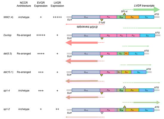 Schematic representation of NCCR architecture and EVGR and LVGR expression pattern of BKPyV strains. BKPyV NCCR architecture, Sp1 binding sites and expression levels are schematically summarized for the archetype (WW1.4), the laboratory-derived rr-NCCR (Dunlop), isolates from kidney transplant patients carrying rearranged NCCRs: BKPyV rr-NCCR del(5.3) and del(15.10) genome, as well as the BKPyV archetype NCCR carrying point mutations inactivating Sp1 binding to LVGR-proximal (sp1-4) and EVGR-proximal binding sites (sp1-2). Sp1 binding to the directional (non-palindromic) sequences is indicated as yellow triangle, dashed-line triangles indicate point mutations. The sequence blocks O, P, Q, R and S are indicated by coloured boxes and their respective length in base pairs in subscripts. The relative expression levels of the EVGR and the LVGR is represented by the thickness of the red and green arrows, whereby +++++, very strong; to + weak (see references [24,29,30]).