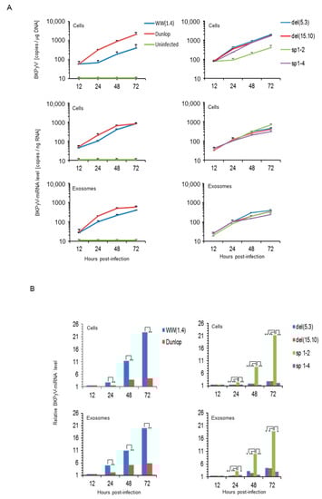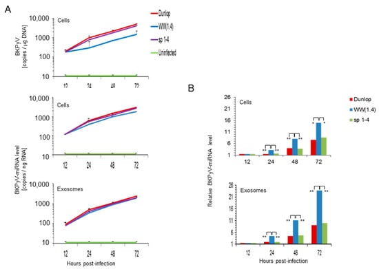 Direct comparison of the miRNA levels expressed per BKPyV genome copy number revealed significantly higher expression in cells and in exosome preparations generated during archetype BKPyV infection than observed for the rr-NCCR-Dunlop strain (Figure 2B; left panels).