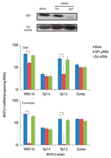 Sp1 knock-down was verified by immunoblotting demonstrating a significant reduction in the siRNA-SP1- but not in the scrambled siRNA- or the mock-treated control cells (Figure 3; top panel). In the mock and scrambled siRNA controls, the original observation was confirmed showing high levels of BKPyV-miRNA following archetype- and (sp1-2)NCCR-BKPyV infection, whereas low levels were seen following (sp1-4)NCCR-BKPyV and Dunlop infection, both in cells and corresponding exosome preparations (Figure 3; blue and green bars). In the siRNA-SP1 treated cells, no change was seen in BKPyV-miRNA levels in Dunlop- or (sp1-4)NCCR-BKPyV-infected cells, whereas a significant reduction was seen in archetype and (sp1-2)NCCR-BKPyV-infected cells (Figure 3; red bars). The results indicated that knock-down of Sp1 protein by siRNA was associated with a significant reduction in cellular and exosomal miRNA levels in BKPyV strains having an intact SP1-4 binding site, whereas there was little change in cells infected with virus strains showing constitutively activated EVGR expression. Thus, Sp1 availability for binding on the SP1-4 site appeared to play a key role in BKPyV-miRNA expression levels.