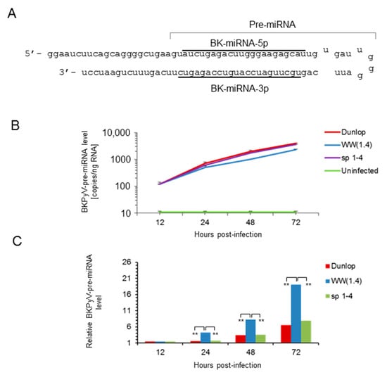 Time course of BKPyV pre-miRNA expression in infected RPTECs. (A) Schematic representation of the BKPyV pre-miRNA hairpin and the corresponding BKPyV-miRNA-5p and miRNA-3p sequence (underlined). (B) Time course of BKPyV pre-miRNA expression levels after infection of RPTECs with the indicated strains. Mean values ± standard deviation of 3 independent experiments are shown. (C) Comparison of relative BKPyV pre-miRNA expression levels per BKPyV genome copy (template) in cells. Results are expressed as BKPyV-miRNA levels normalized to BKPyV genome copy number, archetype WW(1.4) values at 12 h post-infection are set to 1 (-fold; ** p < 0.01).