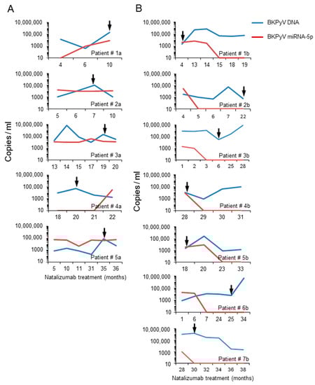 BKPyV DNA viral load and miRNA-5p expression in urine samples from multiple sclerosis patients. Urine sample were analysed over indicated time of follow-up and at the indicated time points, urine BKPyV loads and miRNA levels in exosome preparations were determined. Arrows indicate the time at which NCCR sequence was obtained from urine samples. Panels on the left show the results obtained for 5 patients with BKPyV carrying archetype NCCRs (patient ID 1a–5a); Panels on right show those with rearranged NCCR-BKPyV (patient ID 1b–7b).