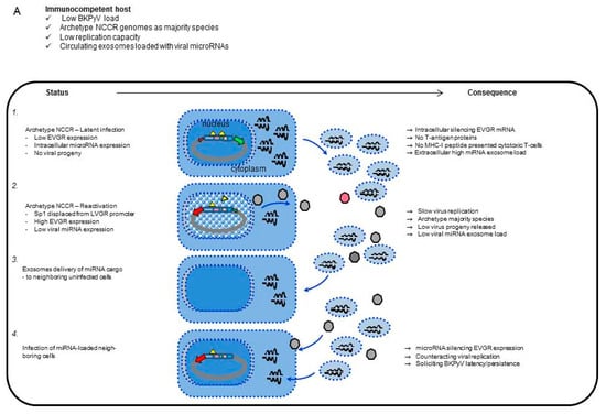 Finally, there is increasing evidence reported that other viruses including those that have the propensity to establish latent/persistent infections such as herpesviruses use miRNA regulation not only intracellularly but also in exosomes [57]. Thus, besides a principle role in virus biology, our data, together with those of other researchers, strongly suggest that viral miRNA should be explored further in a virological and clinical context. To integrate our results into the work of other researchers and to stimulate the corresponding projects, we present a model (see Figure 8) in which host cell signals, viral NCCR activity and miRNA expression permit fine tuning of persistence, reactivation of replication, spread to neighbouring host cells, for example, in the epithelial monolayer of the renal tubules and hiding from cytotoxic large T-antigen-specific CD8 T-cells, unless the host is immunocompromised. The potential role of exosomes and miRNA cargo in cell to cell communication offers an interesting possibility that could potentially be harnessed for antiviral therapy.