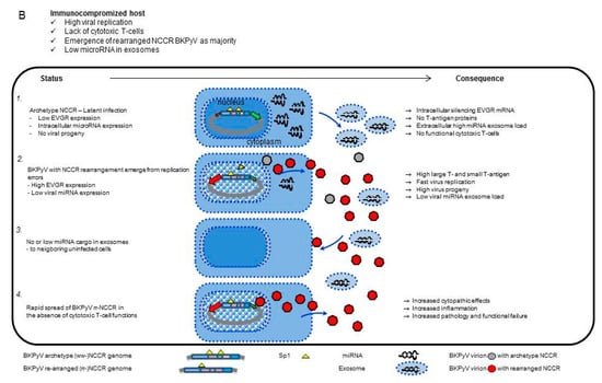 Model of BKPyV miRNAs expression and exosome traffic. (A) Immunocompetent host:1- Archetype NCCR-BKPyV establishes latent infection with low EVGR expression and strong silencing by high-level miRNA expression; 2- Displacement of Sp1 from SP1-4 through host cell activation permits activation of EVGR expression and lowering of miRNA expression; 3- Exosomes deliver BKPyV miRNA cargo to uninfected cells; 4- Subsequent infection with archetype BKPyV counteract new rounds of viral replication, thereby avoid recognition by cytotoxic T-cells. (B) Immunocompromised host: 1- Status and consequences during BKPyV archetype persistent infection; 2- BKPyV with rearranged NCCR emerge in immunocompromised patients as the immune selection pressure fades; 3- No or low miRNA cargo in exosome delivery to uninfected neighbouring cells; 4- Rapid spread, increased cytopathology and functional failure.