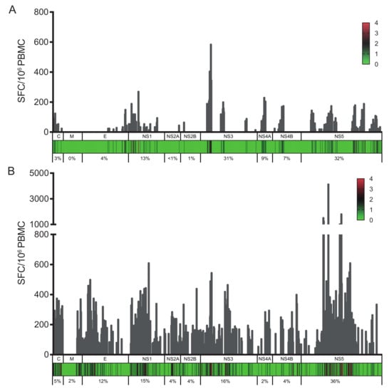 Cumulative IFN-γ responses (as spot-forming cells (SFCs) per million cells) for each overlapping peptide spanning the ZIKV proteome. (A) SFCs per million cells are shown for donors from group B; (B) SFCs per million cells are shown for donors from groups C, D, and E. The heat map indicates the number of donors with a positive IFN-γ response to each peptide within each protein (C, capsid; M, membrane; E, envelope, NS1, NS2A, NS2B, NS3, NS4A, NS4B, and NS5). The numbers below each graph represent percentages of the total response for each protein.