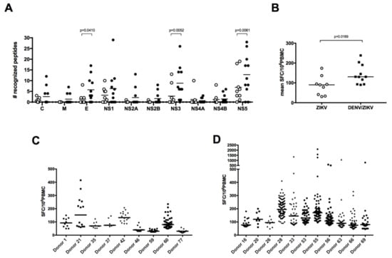 Given the ZIKV-specific antibody response against NS1 and the low level of CD4 T-cell cross-reactivity between DENV and ZIKV against the E and NS1 proteins [18], we wished to compare, among the immunodominant epitopes, the T-cell responses in PBMCs from ZIKV-immune only (group B) donors with those from DENV/ZIKV-immune (groups C, D, and E) donors. First, comparison of the frequency of responding T cells between these two different types of donors underlined the higher magnitude of response in donors with evidence of past or current ZIKV and DENV infection relative to donors with a history of ZIKV infection only (Figure 1A,B). The number of stimulating peptides per donor for each viral protein, as well as the average response per donor differed in these two groups, with a significantly broader response against the E, NS3, and NS5 proteins and a higher magnitude of response in DENV/ZIKV-immune (Figure 2A,B). To determine whether this difference concerned only a small number of peptides that elicit a stronger response in each donor, or if it concerned the majority of the peptides, we plotted the frequency of responses against the different peptides, per donor, in the two different groups. Two out of nine individuals among the ZIKV-immune DENV-naïve (group B) donors revealed a median response higher than 100 SFC/million cells, whereas six out of 11 DENV/ZIKV-immune (groups C, D, and E) donors developed this strong response, which was also directed against a higher number of peptides (Figure 2C,D). This result reveals the activation of a higher frequency of T cells against ZIKV peptides, with a higher magnitude of response, in donors previously or currently infected with DENV, in comparison with naïve donors. This strongly argues for the existence of cross-reactive T cells, these T cells being primed during the initial infection with DENV and expanded thereafter during the following infection with ZIKV, as shown recently in mice and in humans, after sequential infection with DENV and ZIKV [22,23].