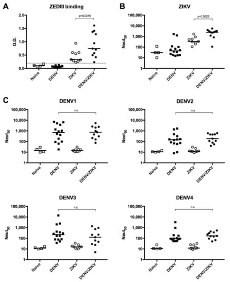 Analysis of ZIKV EDIII (ZEDIII)-binding and ZIKV- and DENV-neutralizing activity of plasma samples from DENV- and/or ZIKV-immune donors. (A) Detection of ZEDIII-binding antibodies by ELISA; (B) quantification of neutralizing activity against ZIKV; (C) quantification of neutralizing activity against DENV1, 2, 3, and 4. Naïve: plasma samples from naïve donors; DENV: plasma samples from DENV-immune ZIKV-naïve donors; ZIKV: plasma samples from ZIKV-immune DENV-naïve donors; DENV/ZIKV: plasma samples from DENV-immune ZIKV-immune donors. Each dot represents one donor and the bars represent the median value for each group of donors. The p values were calculated using the nonparametric two-tailed Mann–Whitney test; n.s.: not significant. The dotted line represents the ELISA cut-off value.