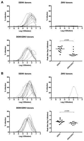 Analysis of Antibody-Dependent Enhancement (ADE) activity of plasma samples on ZIKV and DENV4 infection. (A) Detection of ADE activity on ZIKV infection from plasma samples of DENV-immune ZIKV-naïve (higher-left panel), ZIKV-immune DENV-naïve (higher-right panel), and DENV/ZIKV-immune (lower-left panel) donors. Comparison of the peak enhancement titer of antibodies from DENV-immune ZIKV-naïve and DENV/ZIKV-immune donors (lower-right panel). Each dot represents one donor; (B) detection of ADE activity on DENV4 infection from plasma samples of DENV-immune ZIKV-naïve (higher-left panel), ZIKV-immune DENV-naïve (higher-right panel), and DENV/ZIKV-immune (lower-left panel) donors. Infectivity curves for each donor are shown. The p values were calculated using the nonparametric two-tailed Mann–Whitney test. The dotted line represents the ELISA cut-off value.