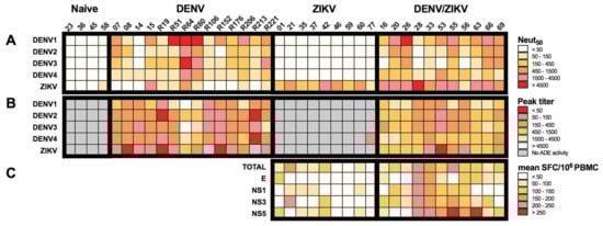 Specificity and cross-reactivity of antibody and T-cell responses from donors with DENV and/or ZIKV infection. (A) Heat map of the neutralizing activity of plasma samples from DENV-immune ZIKV-naïve, ZIKV-immune DENV-naïve, and DEN/ZIKV-immune donors on DENV1-4 and ZIKV infection. (B) Heat map of the ADE activity of plasma samples from DENV-immune ZIKV-naïve, ZIKV-immune DENV-naïve, and DENV/ZIKV-immune donors on DENV1-4 and ZIKV infection; (C) Heat map of the mean T-cell response against peptides from the whole ZIKV proteome (TOTAL) or the immunodominant proteins of PBMCs from ZIKV-immune DENV-naïve and DENV/ZIKV-immune donors; each column represents one donor.