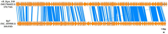 - Zhang, C.; Liu, W.; Ren, H. Complete Genome Sequence of Bp7, an Escherichia coli Bacteriophage with a Wide Host Range. J. Virol. 2012, 86, 13832. [Google Scholar] [CrossRef] [PubMed]