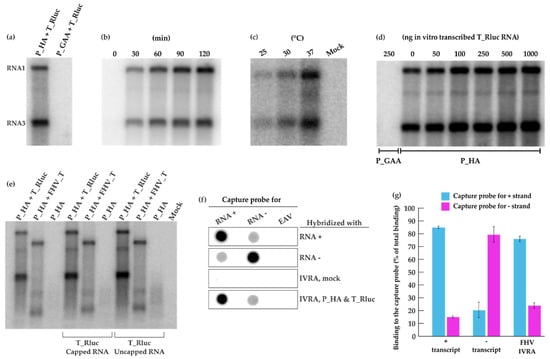 To study the polarity of the FHV RNA synthesized, 32P-labeled IVRA products were hybridized with a membrane containing capture probes specific to FHV RNA of positive or negative polarity and a capture probe corresponding to EAV genomic fragment as a negative binding control. (Figure 3f). The IVRA products from mock samples did not show significant binding while the RNA synthesized in vitro by the isolated CMP strongly hybridized with the capture probe specific for the plus-strand RNA. Minor binding to the capture probe specific for the minus-strand RNA was observed (Figure 3f). 32P-labeled plus- and minus-RNA transcripts of the FHV template showed binding to both capture probes and thus the signals were quantified (Figure 3g). A strong hybridization was detected with the probe recognizing the plus strand and RNA synthesized in the IVRA from P_HA + T_Rluc (76%). The signal observed by the probe recognizing the minus strand (24%) was similar to the binding of minus transcript and therefore considered as background binding. This demonstrates that RNA products produced in vitro are mainly of positive polarity.