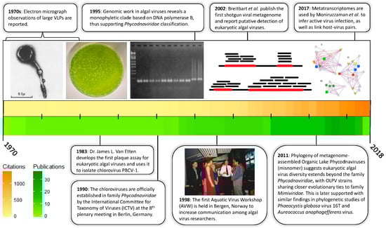 Timeline of eukaryotic algal virus research with important milestones highlighted. Colored bars represent the annual citations and publications generated from a Web of Science Citation Report using the field tag TS = (algal virus) for all databases. The search was conducted on 8 May 2018 at 11:00 a.m. Citation Report results were visualized as heatmaps using custom R scripts. Electron micrograph image [10] and electrophoretic gel [11] reprinted by permission. Network analysis [12] reprinted under authority of Creative Commons.