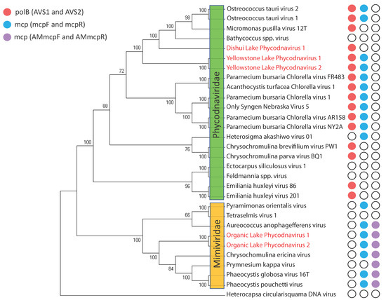 Phylogenetic tree depicting the evolutionary relationships of algal NCLDVs based on amino acid alignment (ClustalW) of the core gene, DNA polymerase B (see in Supplemental Table S2). The tree was built using the maximum likelihood method based on the JTT matrix-based model with 200 iterations in MEGA7 [117]. Viruses belong either to the family Phycodnaviridae or are recognized “extended members” of the family Mimiviridae. The recently discovered dinoflagellate infecting virus, Heterocapsa circularisquama DNA virus, was used to root the tree and shows little similarity to other algal NCLDVs despite being a large DNA virus. Viruses in red text denote metagenome assembled viral genomes, meaning their association with an alga host is putative. Colored dots to the right indicate the viruses can be putatively PCR amplified by the respective PCR primer set based on ≥90% match between each primer and its respective target binding site. This equates to ≤2 primer mismatches, which has been shown to be capable of producing a PCR reaction, albeit at lower efficiency (for RT-qPCR) [126]. The same study shows that three or more mismatches in the same primer completely inhibit a PCR reaction, and is an observation that aligns with failed PCR reactions reported for Ectocarpus siliculosus virus 1 and Feldmannia spp. virus [11]. PCR amplification predictions were done using motif searches in CLC Genomics and the software De-MetaST-BLAST [127].