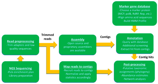 The viral sequences generated from any sequencing approach are subjected to a general analytical workflow involving quality filtering, assembly, annotation, and diversity analyses. Many tools are available to perform this bioinformatic workflow [153], but few of these are designed to complete the full workflow. Moreover, careful understanding of the sequence databases searched in each workflow is necessary to know whether biases exist for particular virus types. GenBank and the nt/nr databases are preferred as these are continually updated and contain information for all virus types; however, their large size can slow processing considerably. To overcome this, creating custom workflows using marker genes of interest can speed up processing time while maintaining the ability to detect diverse virus types.