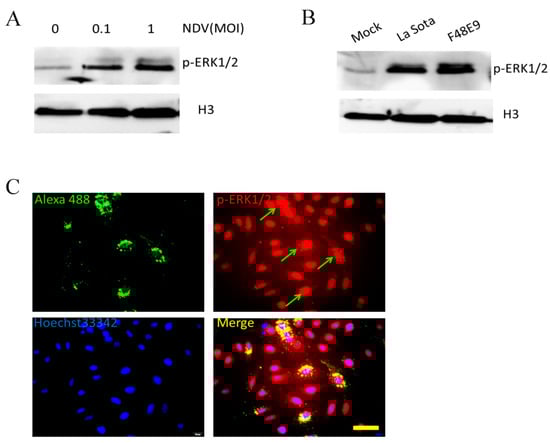 Figure 1. Newcastle disease virus (NDV)-induced phosphorylation of extracellular signal-regulated kinase (ERK)1/2 in HeLa cells. Phospho (p)-ERK1/2 levels in HeLa cells after (A) different doses of NDV (F48E9 strain; 1 multiplicity of infection (MOI)) and (B) different strains of NDV (La Sota and F48E9; 1 MOI). Cell lysates were analyzed 12 h post-infection by Western blotting using a p-ERK1/2 antibody and H3 histone as the reference. (C) HeLa cells were infected with NDV (0.1 MOI). At 12 h post-infection, the cells were stained with chicken anti-NDV serum and a rabbit anti-p-ERK1/2 antibody, which was followed by staining with goat anti-rabbit Alexa Fluor® 594 (red) and goat anti-chicken IgY Alexa Fluor® 488 (green) as secondary antibodies. Nuclei were subsequently stained with Hoechst 33342. Images were captured using a Leica fluorescence microscopy (400×), bar = 50 μm.